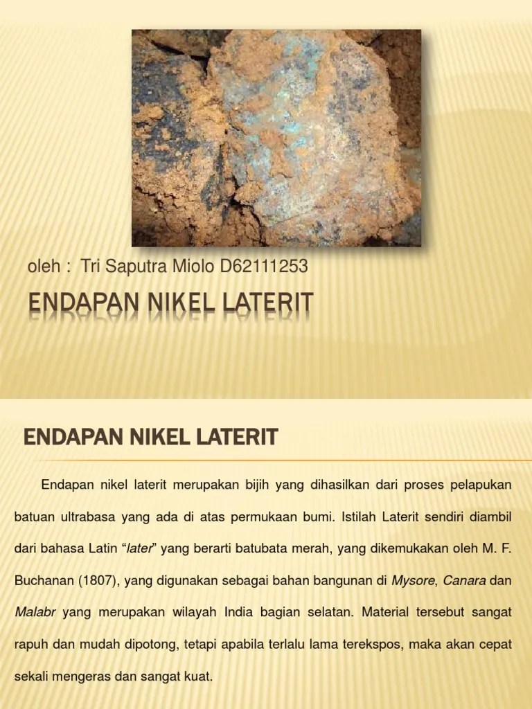 Batuan induk endapan nikel laterit adalah batuan ultrabasa; Penelitian ini bertujuan untuk mendapatkan metode . Meskipun 72% dari tambang nikel berbasis bijih laterit, 60% dari produksi primer nikel berasal dari bijih sulfida (superiadi, 2007).